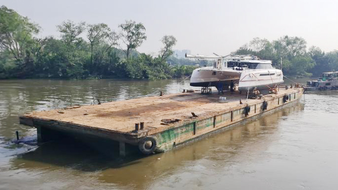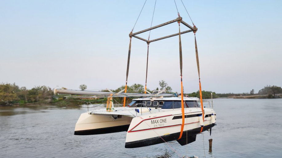 Dưới đây là hình ảnh của một chiếc du thuyền buồm được nâng lên bằng cần cẩu để rời khỏi nhà máy sản xuất và tiếp tục cuộc hành trình ra nước ngoài. Chiếc du thuyền buồm này có thể được đưa lên tàu vận chuyển hoặc tự hành vượt đại dương tới nước Úc xa xôi, tạo nên một khoảnh khắc đầy phấn khởi và tự hào.